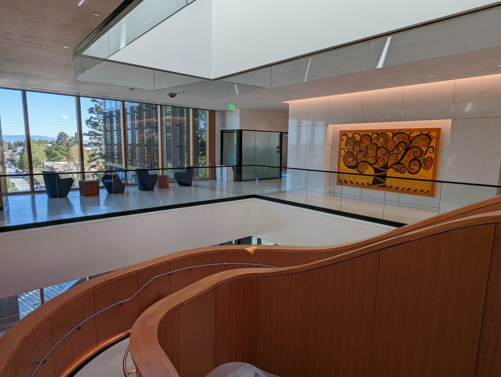 The new City Hall stands at four stories, with 120,000 square feet of office space, next to the adjacent, single-level old City Hall. City services are moving into the new building, which still has some late construction kinks to work out. The new Council Chambers, with seating for 200 residents–twice the capacity of the old City Hall, remains unfinished due to some supply chain issues, but core city services, like the Construction Permit Center, are open for business. A public Grand Opening is scheduled to be held on September 23, which will mark the culmination of the first phase of Sunnyvale’s Civic Center Modernization project. Subsequent development of the Civic Center will involve the construction of a new two-story library and two-story Public Safety headquarters directly across the street from City Hall, along with new parkland and an amphitheater.